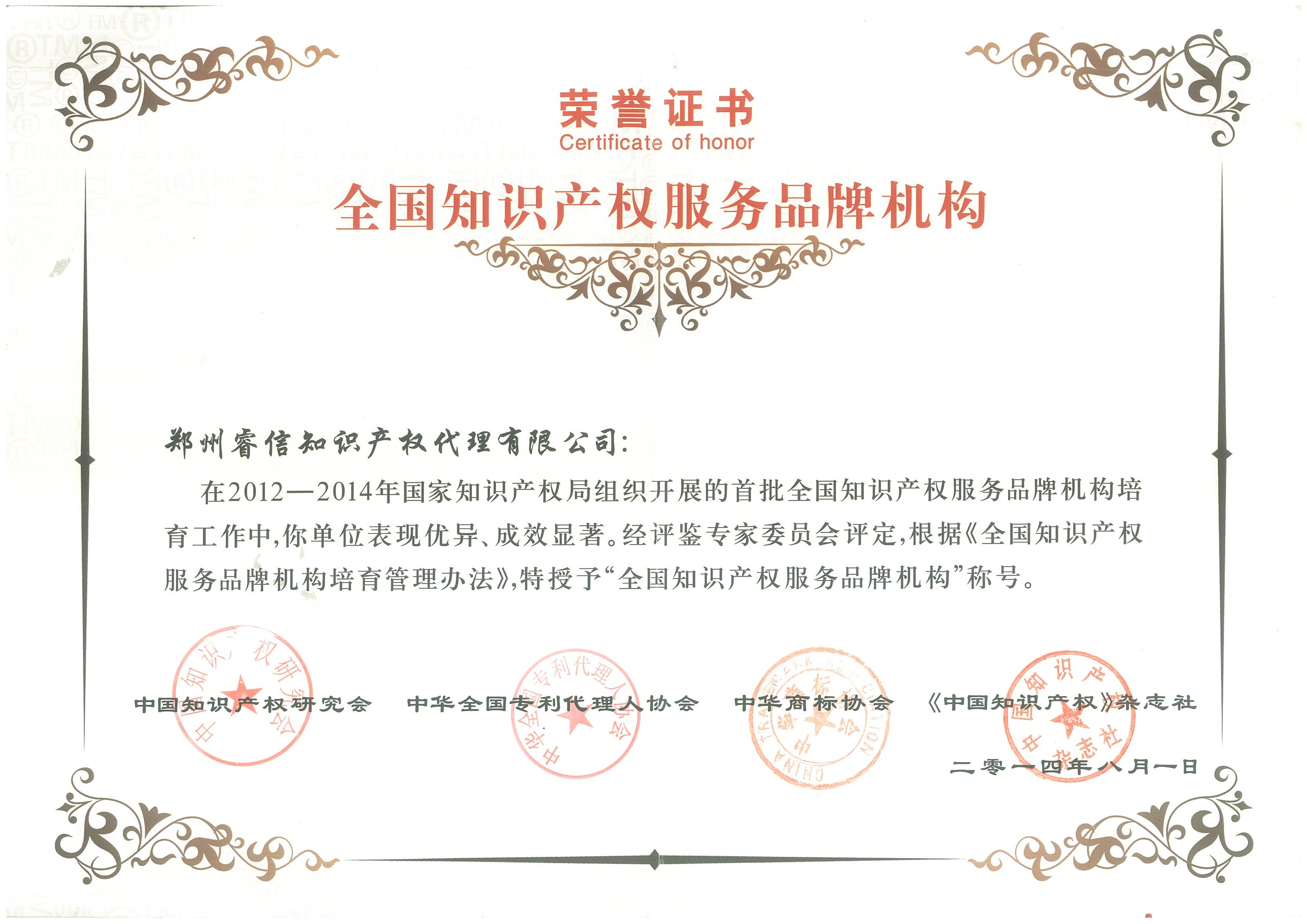 2014年8月1日公司被授予“全國知識(shí)產(chǎn)權(quán)服務(wù)品牌機(jī)構(gòu)”稱號(hào)。