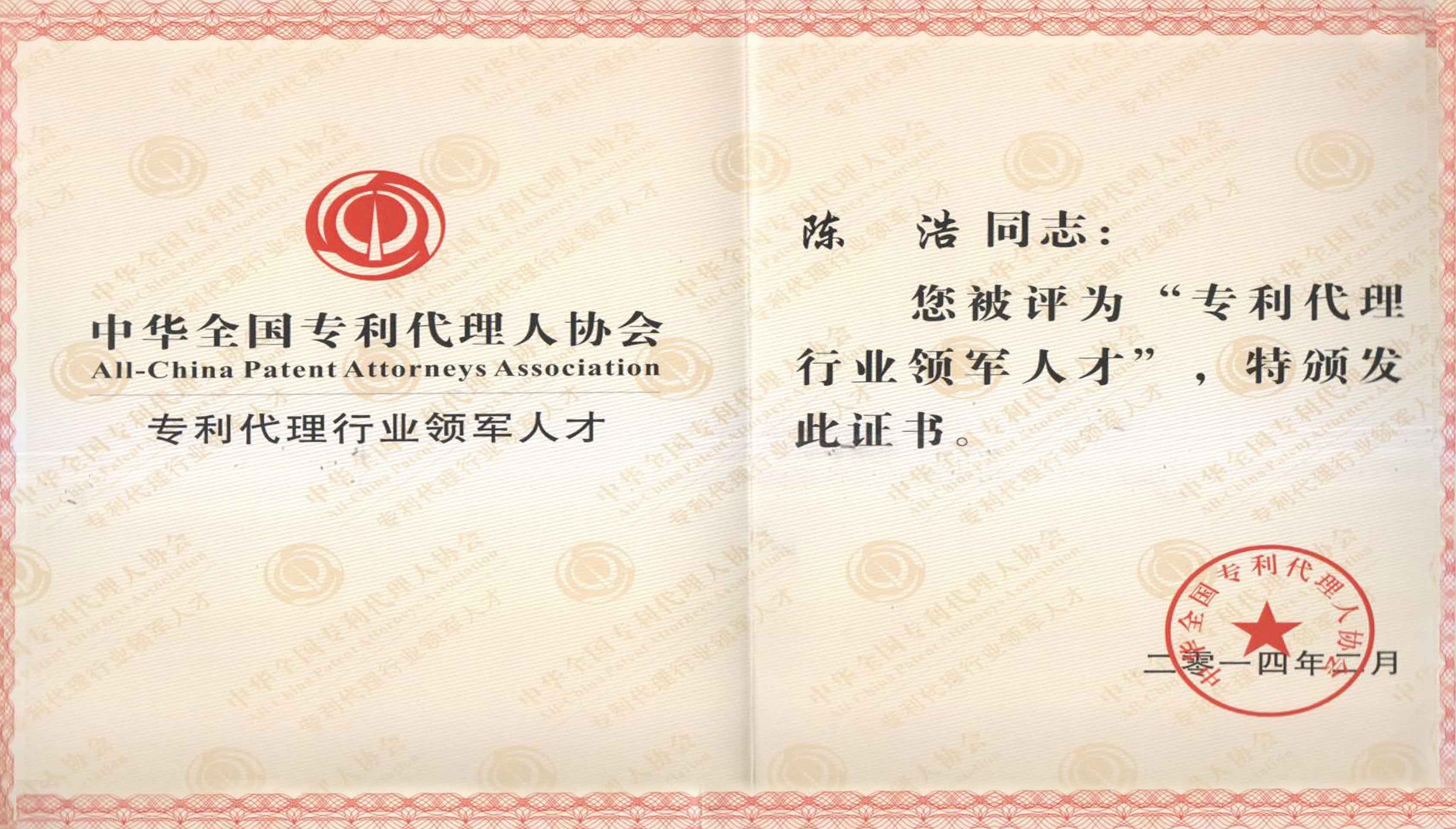 2014年2月公司資深代理人被評(píng)為全國首批專利代理行業(yè)領(lǐng)軍人才。